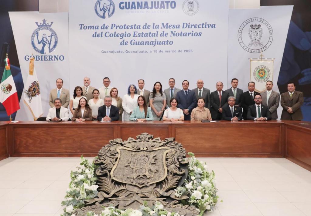 Guanajuato, Gto., a 20 de marzo de 2025.- En una ceremonia solemne, Guadalupe del Pilar Fuentes Cortez, asumió este martes 18 de marzo la presidencia del Colegio Estatal de Notarios Públicos de Guanajuato, convirtiéndose en la nueva líder de la institución que agrupa a los profesionales del derecho notarial en el estado. El acto tuvo lugar en presencia de destacadas figuras del ámbito legal y político, entre ellas la Gobernadora de Guanajuato, Libia García Muñoz Ledo, quien tomó la protesta de ley.