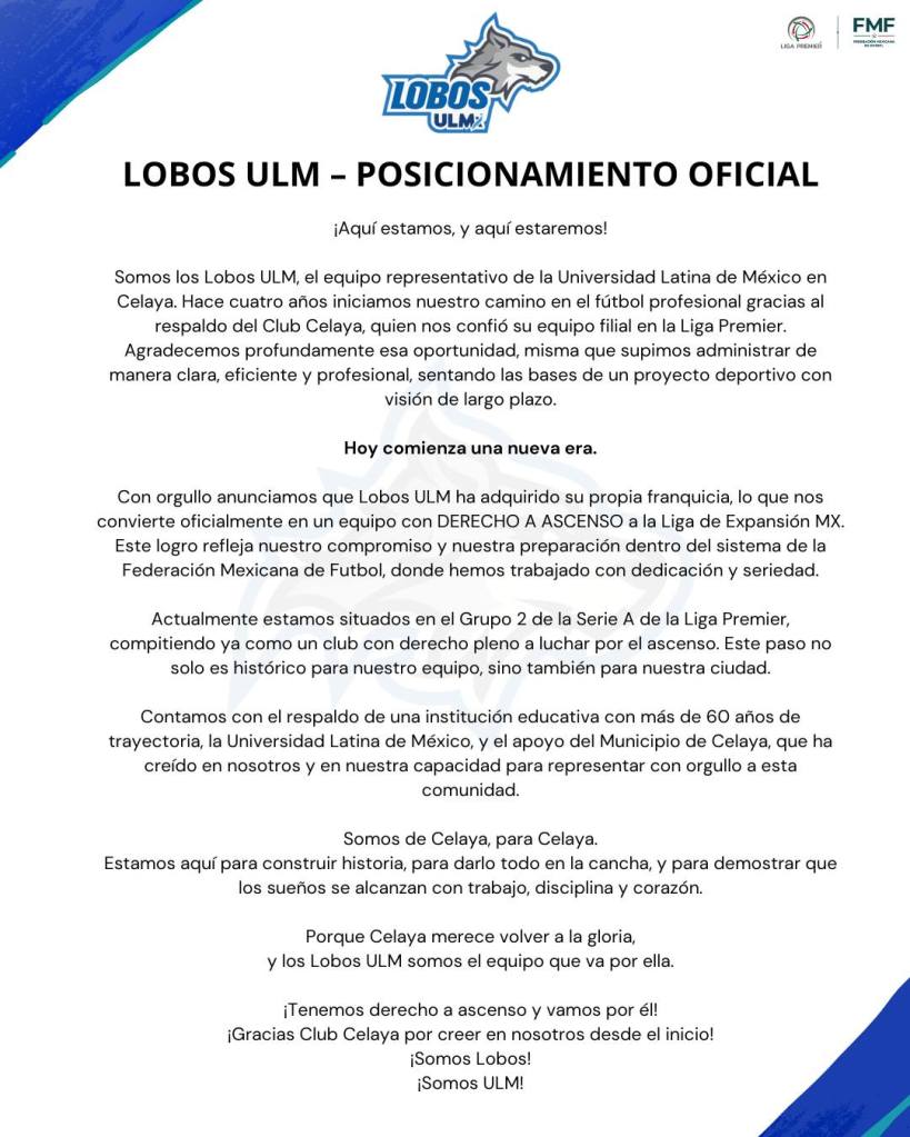 Celaya, Gto., a 28 de junio de 2025.- El equipo de futbol Lobos ULMx, que desde el año 2021 fuera filial del Celaya FC, su origen y respaldo en la Universidad Latina de México, hoy inicia su propio camino con su propia franquicia y con el derecho al ascenso deportivo a la Liga de Expansión. Hoy el equipo agradece al Club Celaya FC, y en su compromiso con la ciudad de Celaya y la región Laja-Bajío, apoyado por el Municipio de Celaya, presenta un programa formativo que dará oportunidad de desarrollo a los jóvenes celayenses, y seguramente los resultados que serán orgullo de esta región del bajío.
