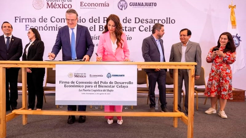 Celaya, Gto., a 13 de agosto de 2025.— En un acto celebrado este martes 12 de agosto de 2025 en la Ciudad de León, a Gobernadora, Libia Dennise García Muñoz Ledo, y el Secretario de Economía del Gobierno de México, Marcelo Ebrard Casaubon, teniendo como testigos al Presidente Municipal de Celaya, Juan Miguel Ramírez Sánchez y a la Secretaria de Economía Claudia Cristina Villaseñor, firmaron del Convenio de Coordinación para poner en marcha el Polo de Desarrollo Económico para el Bienestar “Puerta Logística del Bajío”, el ambicioso “puerto seco” proyectado en Celaya. Este acuerdo posiciona a la ciudad como un nodo logístico estratégico de alcance nacional.