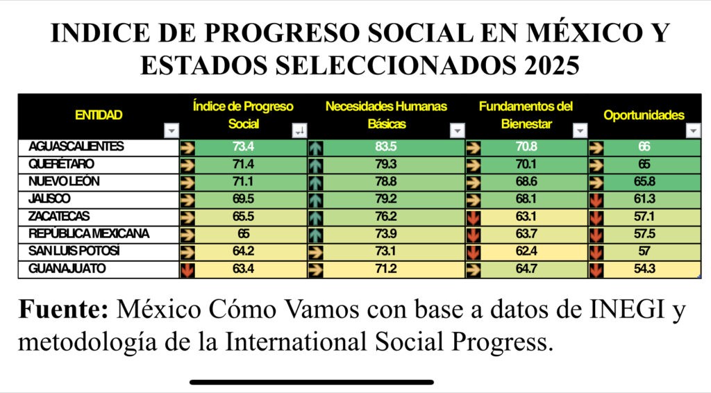 Celaya, Gto., a 3 de diciembre de 2025.- Entre 2015 y 2025, México vivió una década marcada por cambios políticos profundos, una pandemia, una caída histórica de la pobreza… y, sin embargo, un progreso social más bien lento y frágil. El Índice de Progreso Social (IPS) permite mirar esa historia más allá del PIB: mide qué tan bien un país convierte su crecimiento económico en bienestar real para las personas, a partir de 57 indicadores en tres dimensiones: Necesidades Humanas Básicas, Fundamentos del Bienestar y Oportunidades.