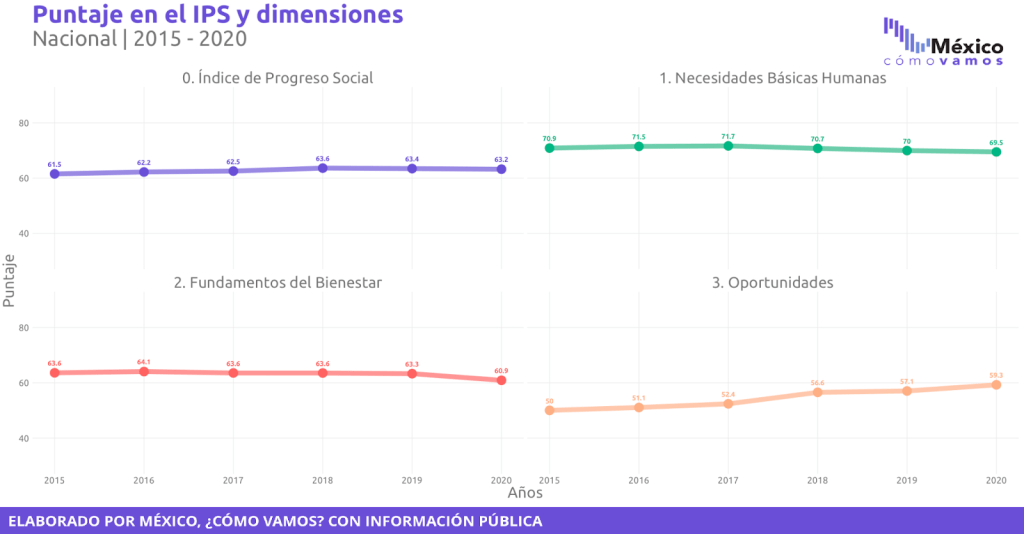 En paralelo, la versión mexicana del Índice de Progreso Social —desarrollada por «México, ¿cómo vamos?» con la metodología del Social Progress Imperative— muestra que el puntaje nacional pasó de alrededor de 60.9 puntos en 2015 a 65.8 en 2023, un incremento acumulado de 4.9 puntos, el nivel más alto desde que se mide la serie 2015–2023