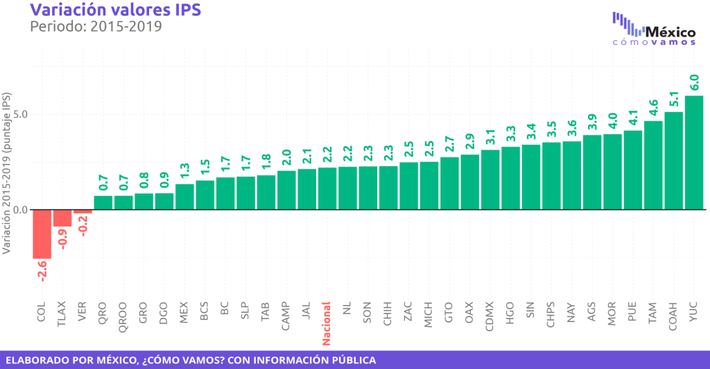 Una de las aportaciones más valiosas del IPS en México es su medición por estados. Desde 2015 se publican puntajes para las 32 entidades, lo que permite ver que la brecha territorial no solo persiste, sino que cambia muy lentamente.